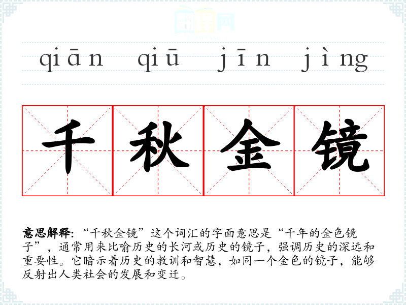 “千秋金镜”这个词汇的字面意思是“千年的金色镜子”,通常用来比喻历史的长河或历史的镜子,强调历史的深远和重要性。它暗示着历史的教训和智慧,如同一个金色的镜子,能够反射出人类社会的发展和变迁。