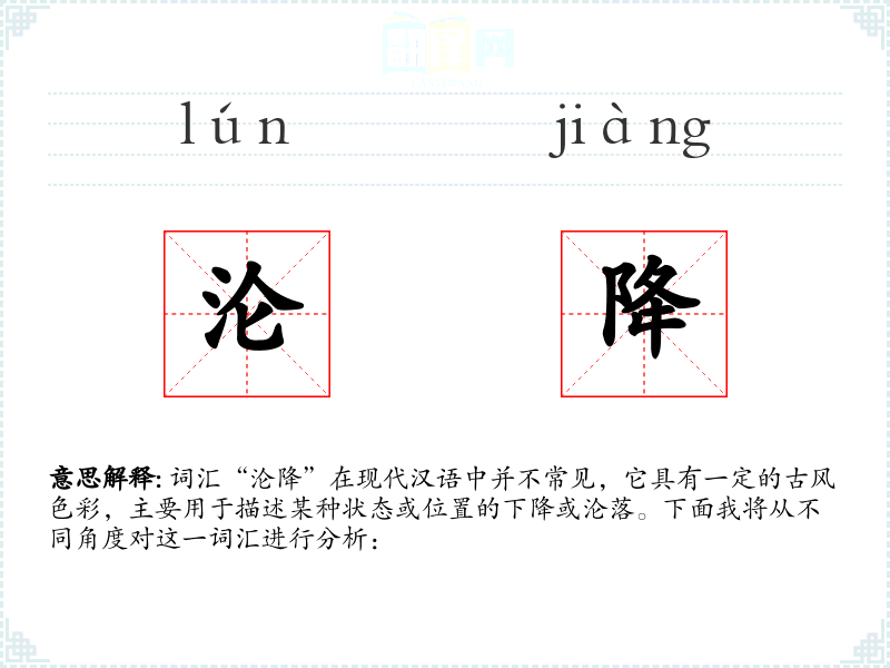 “沦降”是一个富有历史和文化内涵的词汇,虽然在现代汉语中使用频率不高,但它能够丰富语言表达的层次和深度。在学*语言和表达时,了解和掌握这样的词汇有助于更好地理解和欣赏语言的多样性和复杂性。
