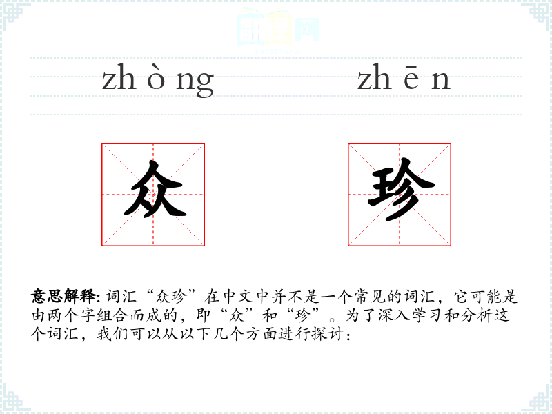 - 词源:“众”和“珍”都是汉语中的基本词汇,组合起来形成一个新的词汇,目前没有特定的历史演变记录。