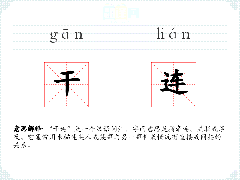 “干连”是一个汉语词汇,字面意思是指牵连、关联或涉及。它通常用来描述某人或某事与另一**或情况有直接或间接的关系。