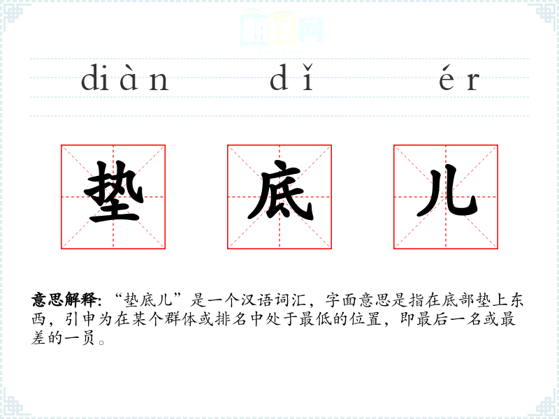 “垫底儿”是一个汉语词汇,字面意思是指在底部垫上东西,引申为在某个群体或排名中处于最低的位置,即最后一名或最差的一员。