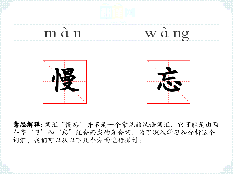 - 在其他语言中,可能没有直接对应“慢忘”的词汇,但类似的表达可以通过组合词汇来实现。
