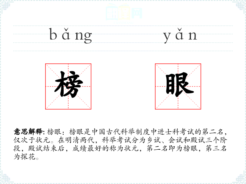 词源:榜眼一词源于古代科举制度,"榜"指榜单,"眼"在这里有突出的意思,合起来即指榜单上第二突出的人。