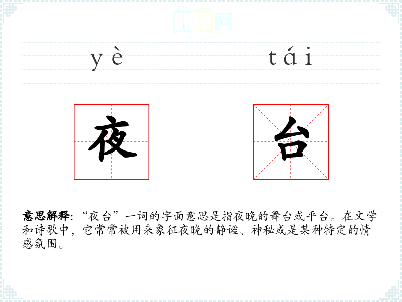 “夜台”一词的字面意思是指夜晚的舞台或平台。在文学和诗歌中,它常常被用来象征夜晚的静谧、神秘或是某种特定的情感氛围。