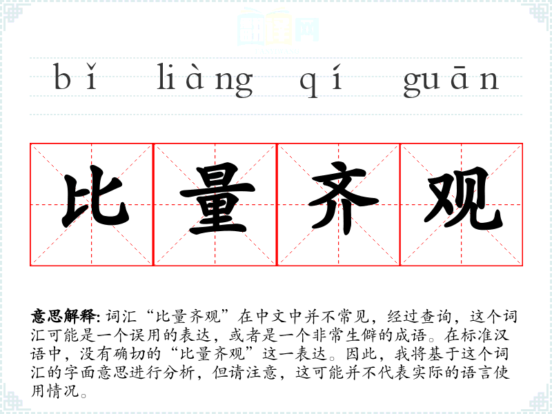 词汇“比量齐观”在中文中并不常见,经过查询,这个词汇可能是一个误用的表达,或者是一个非常生僻的成语。在标准汉语中,没有确切的“比量齐观”这一表达。因此,我将基于这个词汇的字面意思进行分析,但请注意,这可能并不代表实际的语言使用情况。