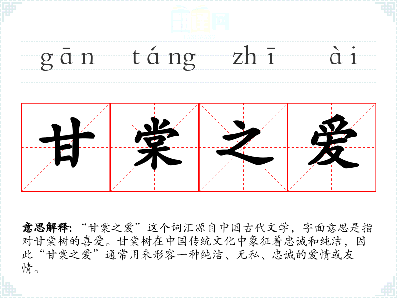 “甘棠之爱”这个词汇源自古代文学,字面意思是指对甘棠树的喜爱。甘棠树在传统文化中象征着忠诚和纯洁,因此“甘棠之爱”通常用来形容一种纯洁、无私、忠诚的爱情或友情。