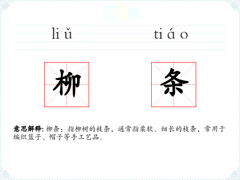 柳条:指柳树的枝条,通常指柔软、细长的枝条,常用于编织篮子、帽子等手工艺品。