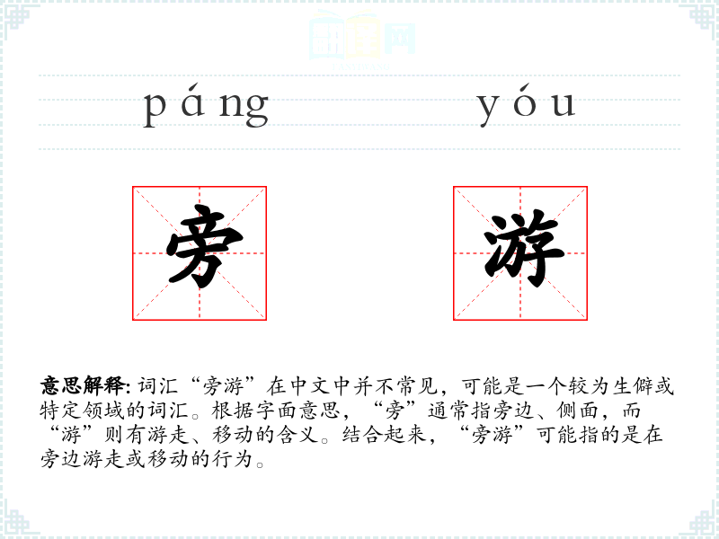 由于“旁游”不是一个常用词汇,其词源和演变可能不太明确。但从字面上看,“旁”和“游”都是较为基础的汉字,组合起来形成了一个描述特定行为的词汇。