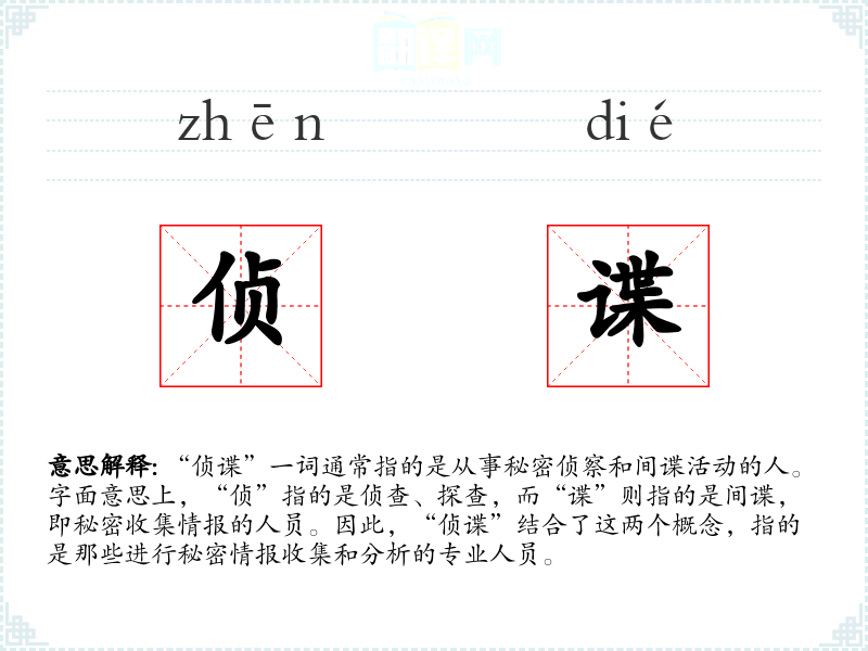 “侦谍”一词通常指的是从事秘密侦察和活动的人。字面意思上,“侦”指的是侦查、探查,而“谍”则指的是,即秘密收集情报的人员。因此,“侦谍”结合了这两个概念,指的是那些进行秘密情报收集和分析的专业人员。