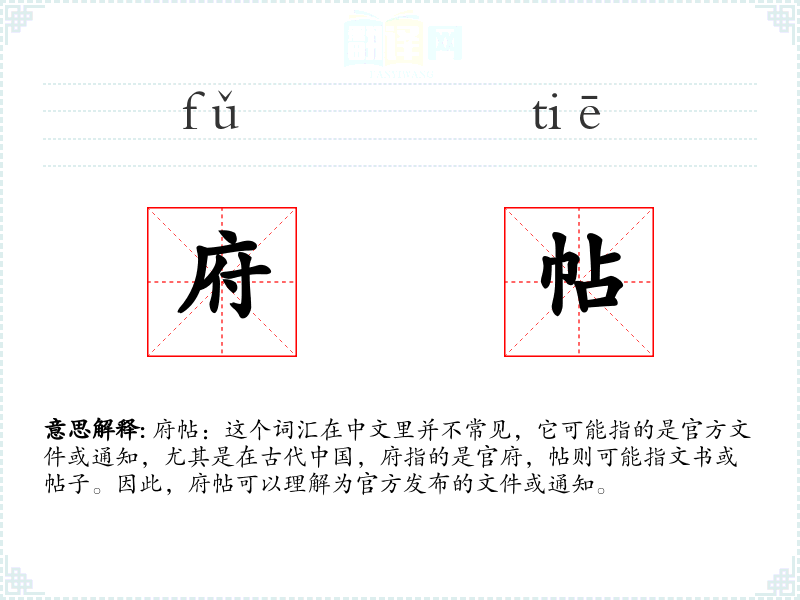 府帖:这个词汇在中文里并不常见,它可能指的是官方文件或通知,尤其是在古代**,府指的是官府,帖则可能指文书或帖子。因此,府帖可以理解为官方发布的文件或通知。