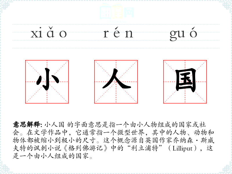 小人国 的字面意思是指一个由小人物组成的国家或社会。在文学作品中,它通常指一个微型世界,其中的人物、动物和物体都被缩小到极小的尺寸。这个概念源自英国作家乔纳森·斯威夫特的讽刺小说《格列佛游记》中的“利立浦特”(Lilliput),这是一个由小人组成的国家。