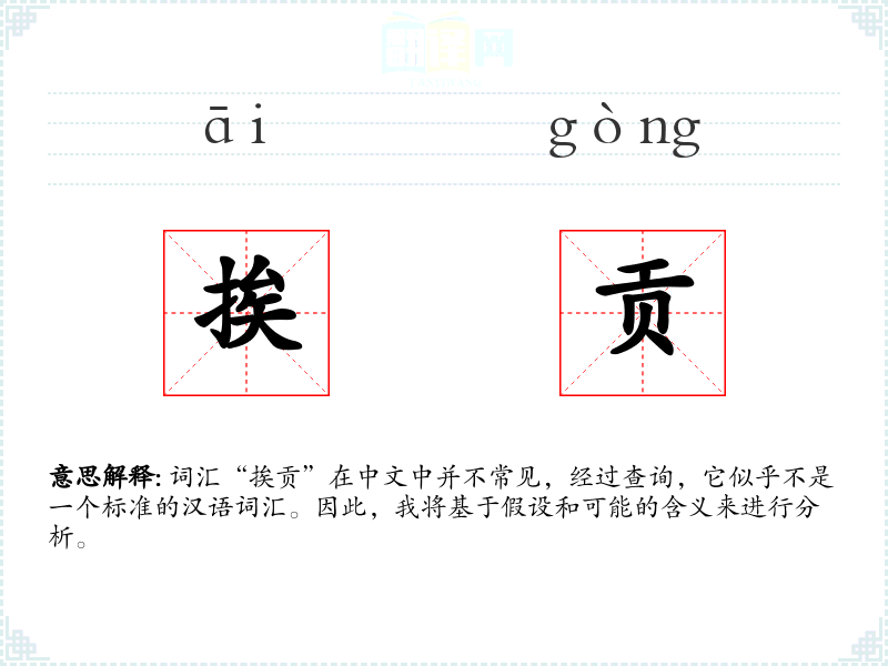 词汇“挨贡”在中文中并不常见,经过查询,它似乎不是一个标准的汉语词汇。因此,我将基于假设和可能的含义来进行分析。
