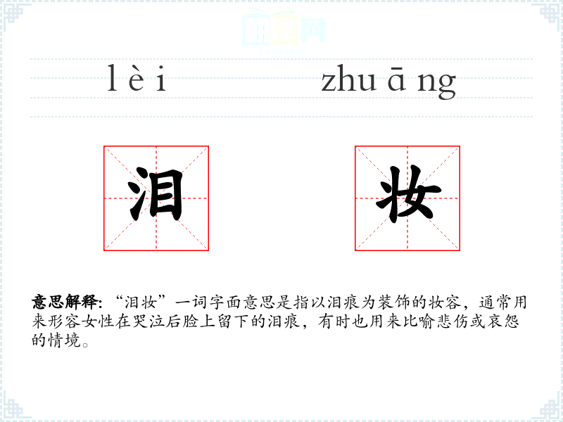 “泪妆”一词字面意思是指以泪痕为装饰的妆容,通常用来形容女性在哭泣后脸上留下的泪痕,有时也用来比喻悲伤或哀怨的情境。