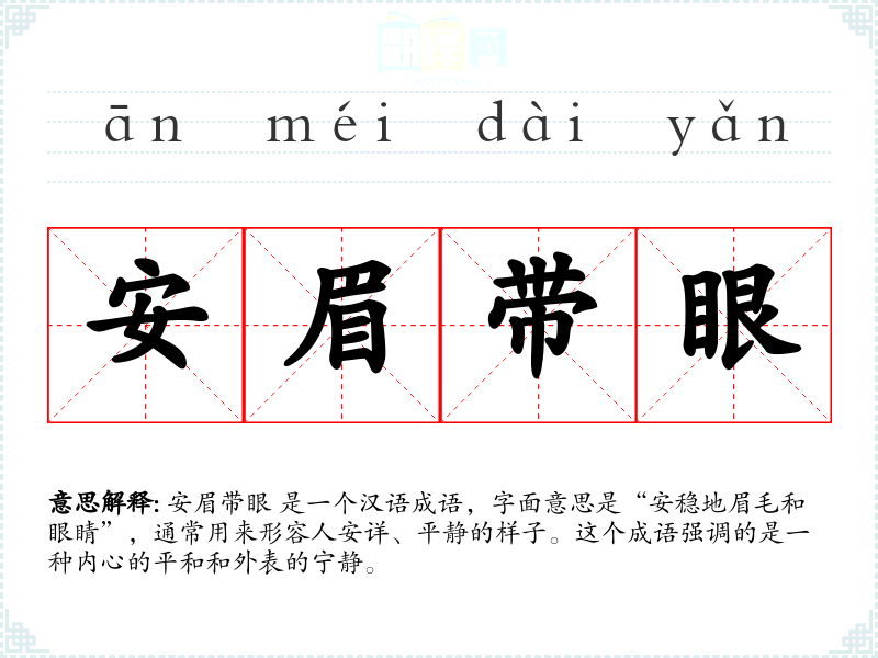 安眉带眼 是一个汉语成语,字面意思是“安稳地眉毛和眼睛”,通常用来形容人安详、平静的样子。这个成语强调的是一种内心的平和和外表的宁静。