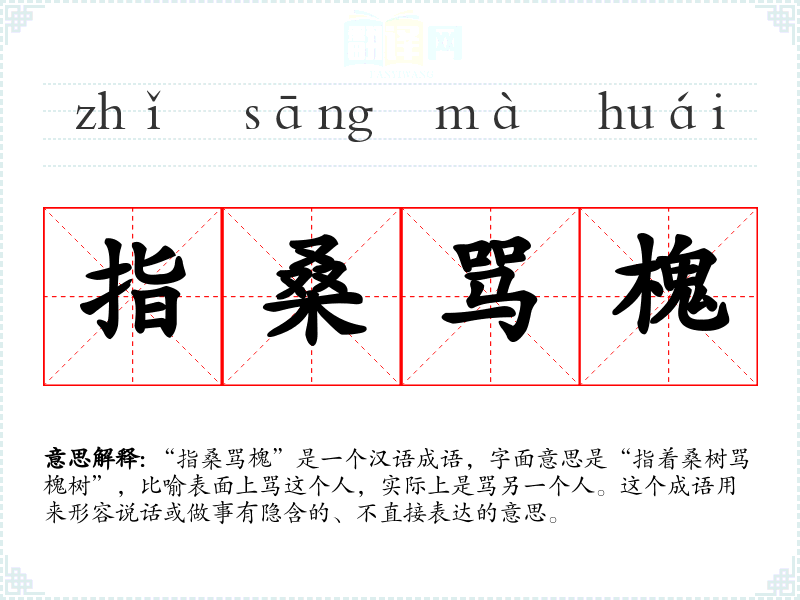 “指桑骂槐”是一个汉语成语,字面意思是“指着桑树骂槐树”,比喻表面上骂这个人,实际上是骂另一个人。这个成语用来形容说话或做事有隐含的、不直接表达的意思。