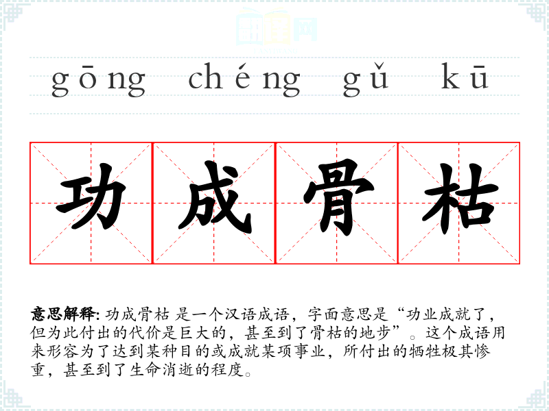功成骨枯 是一个汉语成语,字面意思是“功业成就了,但为此付出的代价是巨大的,甚至到了骨枯的地步”。这个成语用来形容为了达到某种目的或成就某项事业,所付出的牺牲极其惨重,甚至到了生命消逝的程度。