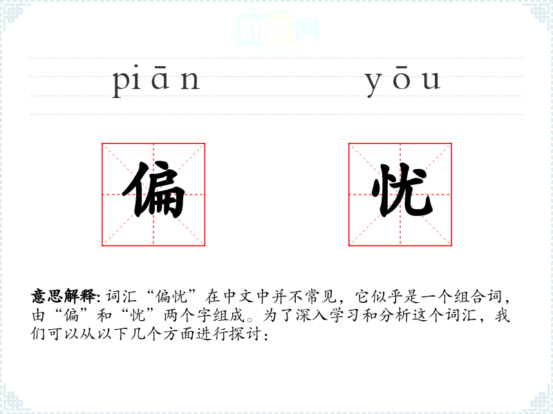 词汇“偏忧”在中文中并不常见,它似乎是一个组合词,由“偏”和“忧”两个字组成。为了深入学习和分析这个词汇,我们可以从以下几个方面进行探讨: