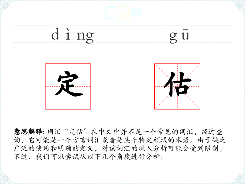 词汇“定估”在中文中并不是一个常见的词汇,经过查询,它可能是一个方言词汇或者是某个特定领域的术语。由于缺乏广泛的使用和明确的定义,对该词汇的深入分析可能会受到限制。不过,我们可以尝试从以下几个角度进行分析: