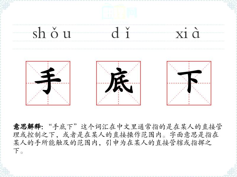 “手底下”这个词汇在中文里通常指的是在某人的直接管理或控制之下,或者是在某人的直接操作范围内。字面意思是指在某人的手所能触及的范围内,引申为在某人的直接管辖或指挥之下。