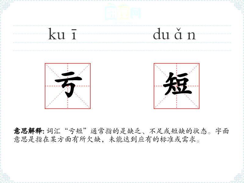 词汇“亏短”通常指的是缺乏、不足或短缺的状态。字面意思是指在某方面有所欠缺,未能达到应有的标准或需求。