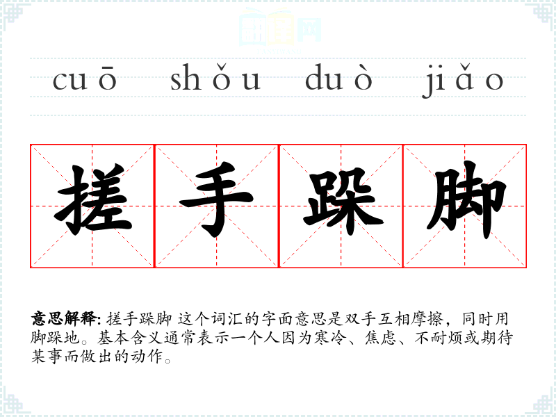 搓手跺脚 这个词汇的字面意思是双手互相摩擦,同时用脚跺地。基本含义通常表示一个人因为寒冷、焦虑、不耐烦或期待某事而做出的动作。