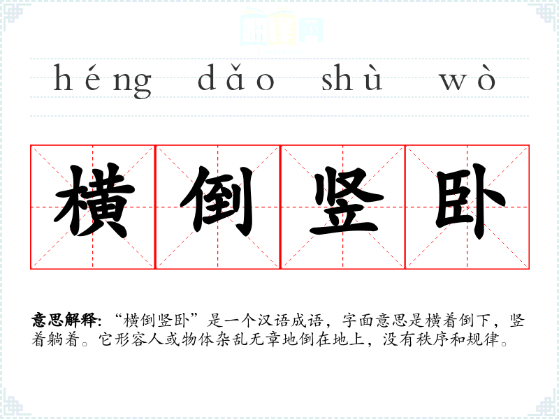 “横倒竖卧”是一个汉语成语,字面意思是横着倒下,竖着躺着。它形容人或物体杂乱无章地倒在地上,没有秩序和规律。