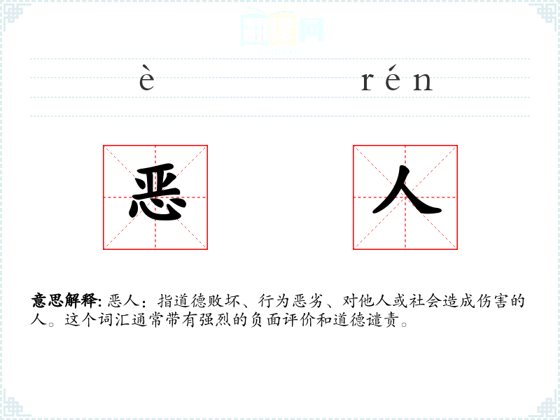 恶人:指道德败坏、行为恶劣、对他人或社会造成伤害的人。这个词汇通常带有强烈的负面评价和道德谴责。