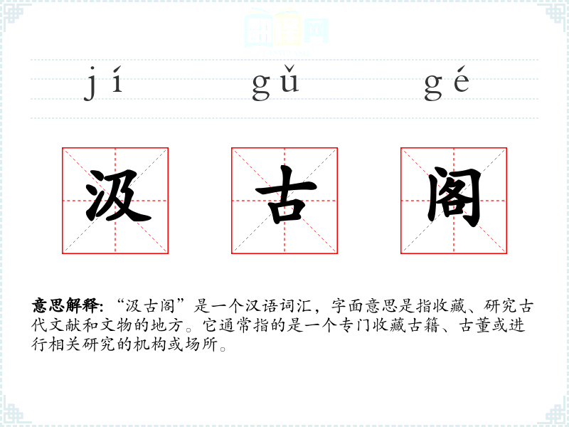 “汲古阁”是一个汉语词汇,字面意思是指收藏、研究古代文献和文物的地方。它通常指的是一个专门收藏古籍、古董或进行相关研究的机构或场所。