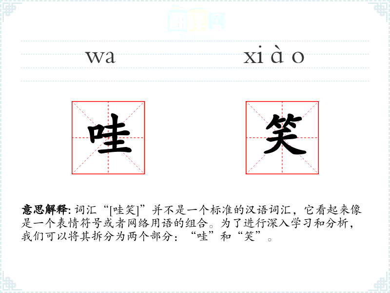 词汇“[哇笑]”并不是一个标准的汉语词汇,它看起来像是一个表情符号或者网络用语的组合。为了进行深入学*和分析,我们可以将其拆分为两个部分:“哇”和“笑”。