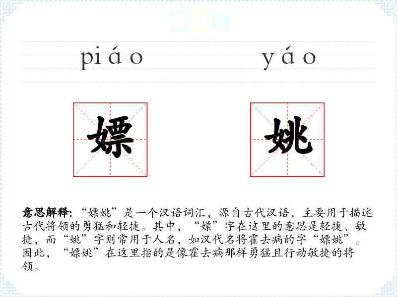 - 古籍中常以“嫖姚”形容将领的英勇与敏捷。