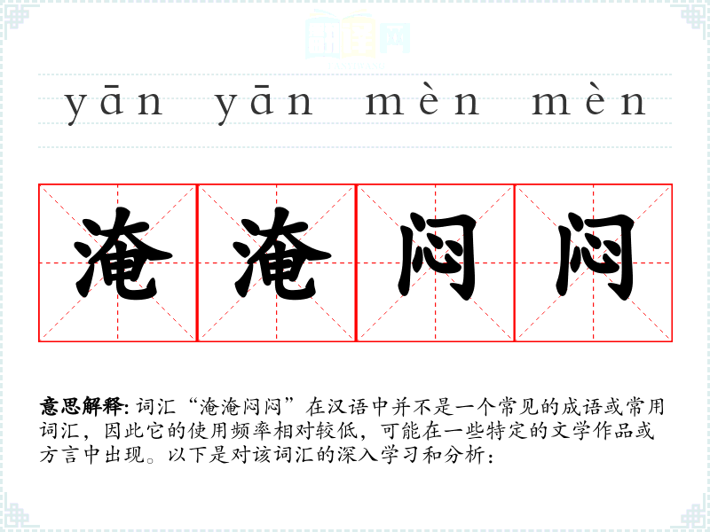 词汇“淹淹闷闷”在汉语中并不是一个常见的成语或常用词汇,因此它的使用频率相对较低,可能在一些特定的文学作品或方言中出现。以下是对该词汇的深入学习和分析: