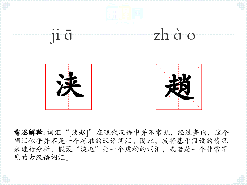 词汇“[浃赵]”在现代汉语中并不常见,经过查询,这个词汇似乎并不是一个标准的汉语词汇。因此,我将基于假设的情况来进行分析,假设“浃赵”是一个虚构的词汇,或者是一个非常罕见的古汉语词汇。
