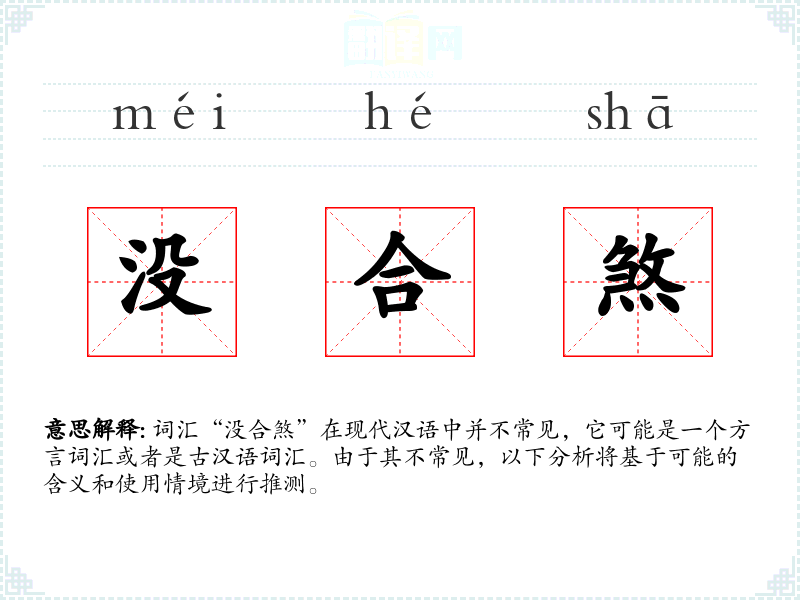 词汇“没合煞”在现代汉语中并不常见,它可能是一个方言词汇或者是古汉语词汇。由于其不常见,以下分析将基于可能的含义和使用情境进行推测。