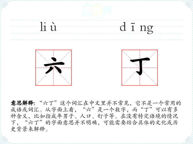 由于“六丁”不是一个常用词汇,它在不同语境下的使用非常有限。在古代文献中,“丁”有时指成年男子,因此“六丁”可能指的是六个成年男子。在某些特定的历史或神话故事中,“六丁”可能指代特定的神祇或人物,但这需要具体的历史文献来证实。