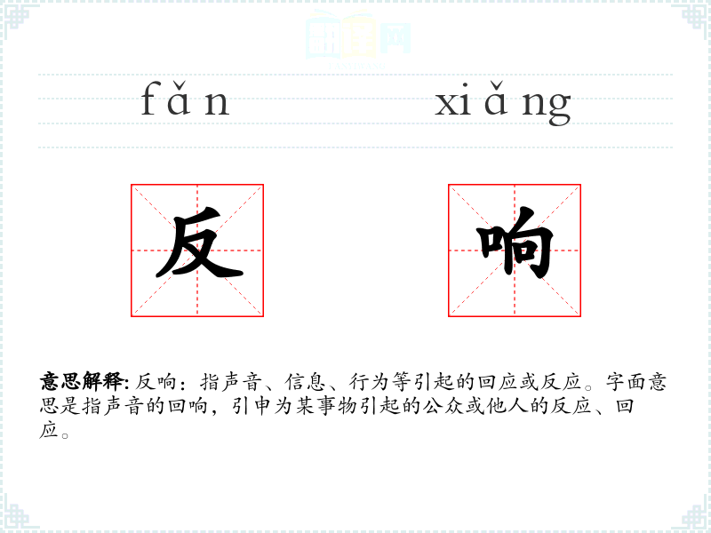 反响:指声音、信息、行为等引起的回应或反应。字面意思是指声音的回响,引申为某事物引起的公众或他人的反应、回应。