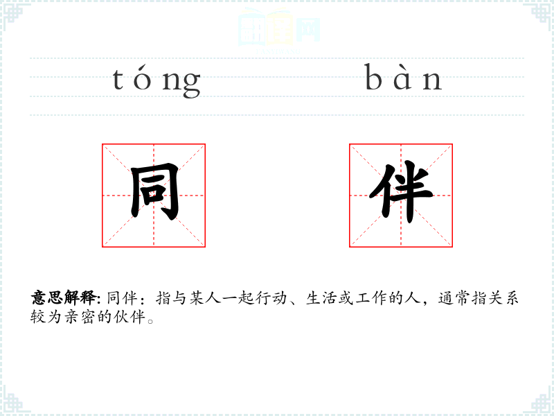 同伴:指与某人一起行动、生活或工作的人,通常指关系较为亲密的伙伴。