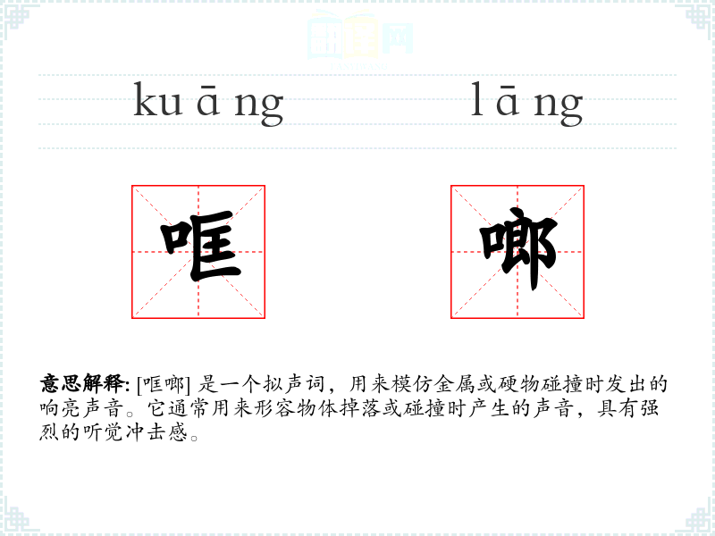 [哐啷] 是一个拟声词,用来模仿金属或硬物碰撞时发出的响亮声音。它通常用来形容物体掉落或碰撞时产生的声音,具有强烈的听觉冲击感。