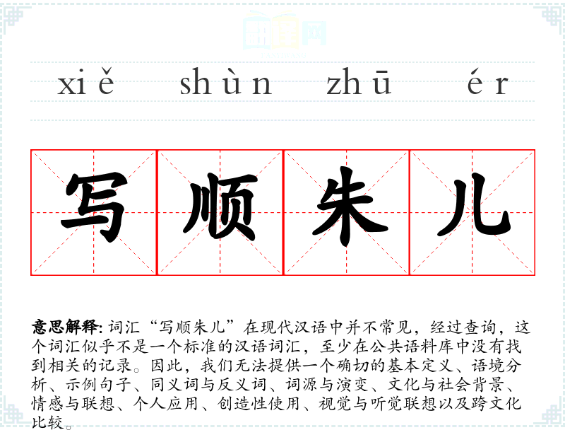 词汇“写顺朱儿”在现代汉语中并不常见,经过查询,这个词汇似乎不是一个标准的汉语词汇,至少在公共语料库中没有找到相关的记录。因此,我们无法提供一个确切的基本定义、语境分析、示例句子、同义词与反义词、词源与演变、文化与社会背景、情感与联想、个人应用、创造性使用、视觉与听觉联想以及跨文化比较。
