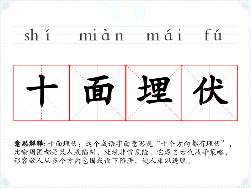 十面埋伏:这个成语字面意思是“十个方向都有埋伏”,比喻周围都是敌人或陷阱,处境非常危险。它源自古代战争策略,形容敌人从多个方向包围或设下陷阱,使人难以逃脱。