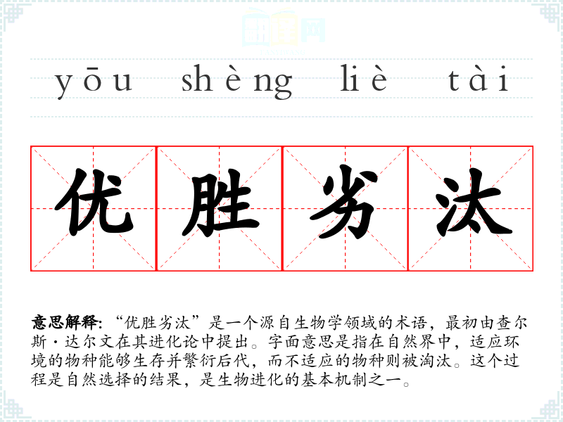 “优胜劣汰”是一个源自生物学领域的术语,最初由查尔斯·达尔文在其进化论中提出。字面意思是指在自然界中,适应环境的物种能够生存并繁衍后代,而不适应的物种则被淘汰。这个过程是自然选择的结果,是生物进化的基本机制之一。