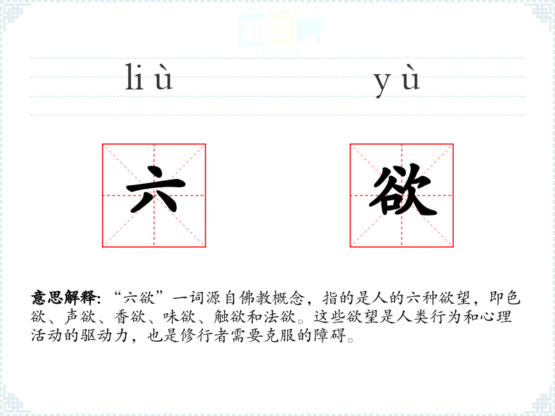 “六欲”一词源自**概念,指的是人的六种欲望,即色欲、声欲、香欲、味欲、触欲和法欲。这些欲望是人类行为和心理活动的驱动力,也是修行者需要克服的障碍。