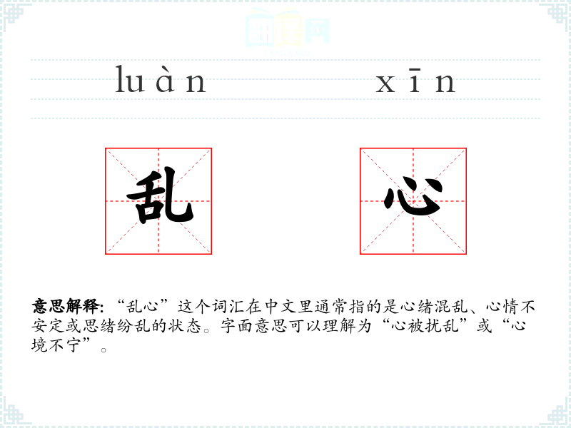 “乱心”这个词汇在中文里通常指的是心绪混乱、心情不安定或思绪纷乱的状态。字面意思可以理解为“心被扰乱”或“心境不宁”。