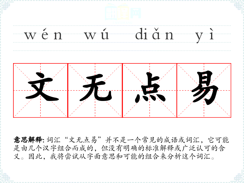 词汇“文无点易”并不是一个常见的成语或词汇,它可能是由几个汉字组合而成的,但没有明确的标准解释或广泛认可的含义。因此,我将尝试从字面意思和可能的组合来分析这个词汇。
