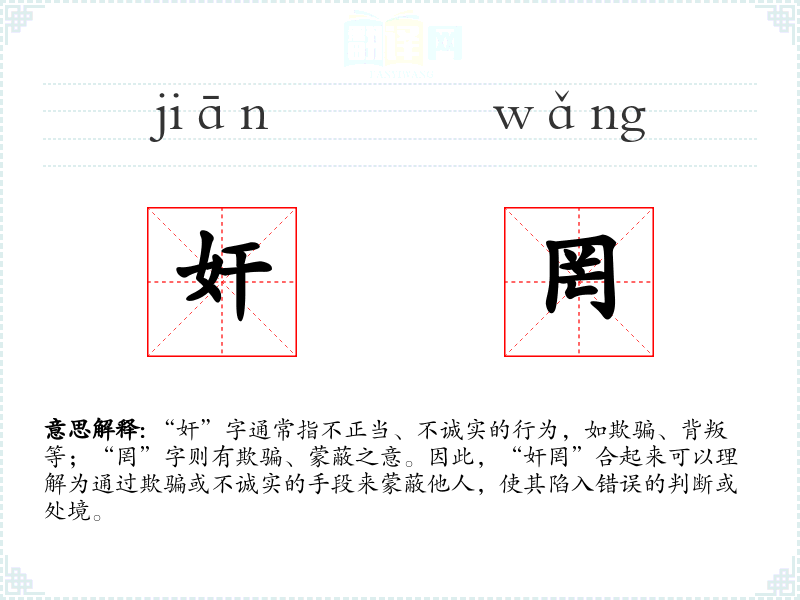 “奸”字通常指不正当、不诚实的行为,如欺骗、背叛等;“罔”字则有欺骗、蒙蔽之意。因此,“奸罔”合起来可以理解为通过欺骗或不诚实的手段来蒙蔽他人,使其陷入错误的判断或处境。