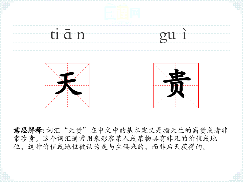 “天贵”这个词汇的词源较为直接,由“天”和“贵”两个字组成。在古代汉语中,“天”常指自然界或宇宙的最高主宰,而“贵”则指价值高、地位尊贵。随着时间的推移,“天贵”逐渐被用来形容那些天生具有高贵特质的人或物。
