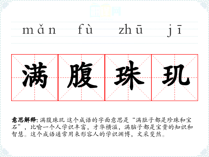 满腹珠玑 这个成语的字面意思是“满肚子都是珍珠和宝石”,比喻一个人学识丰富,才华横溢,满脑子都是宝贵的知识和智慧。这个成语通常用来形容人的学识渊博,文采斐然。