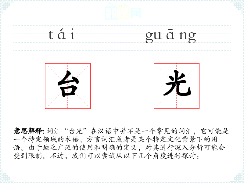 由于“台光”不是一个标准词汇,对其的理解和应用需要依赖具体的上下文。在语言学习和表达中,了解特定领域的术语和方言词汇是非常重要的,这有助于更准确地沟通和理解特定文化背景下的信息。