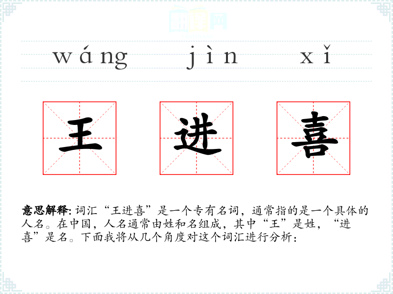 - 词源:“王”是一个非常常见的**姓氏,源自古代的氏族名称。“进喜”作为一个名字,可能是在某个时期由父母根据他们的期望和喜好创造的。