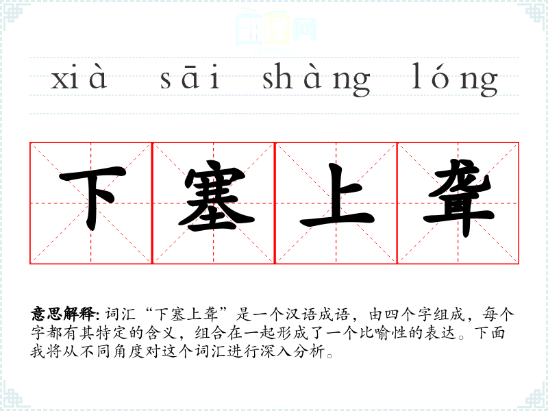 词汇“下塞上聋”是一个汉语成语,由四个字组成,每个字都有其特定的含义,组合在一起形成了一个比喻性的表达。下面我将从不同角度对这个词汇进行深入分析。
