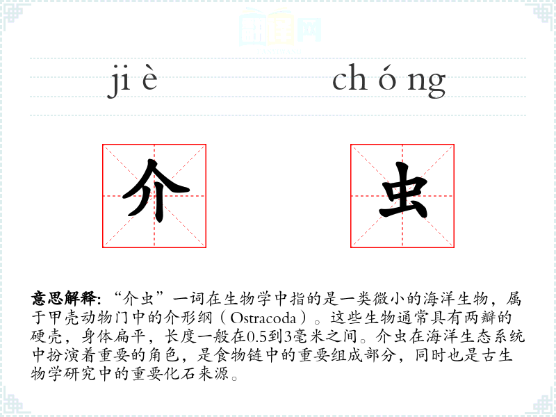 同义词:甲壳动物、微型甲壳类 反义词:(由于“介虫”是一个非常特定的生物学术语,通常没有直接的反义词)